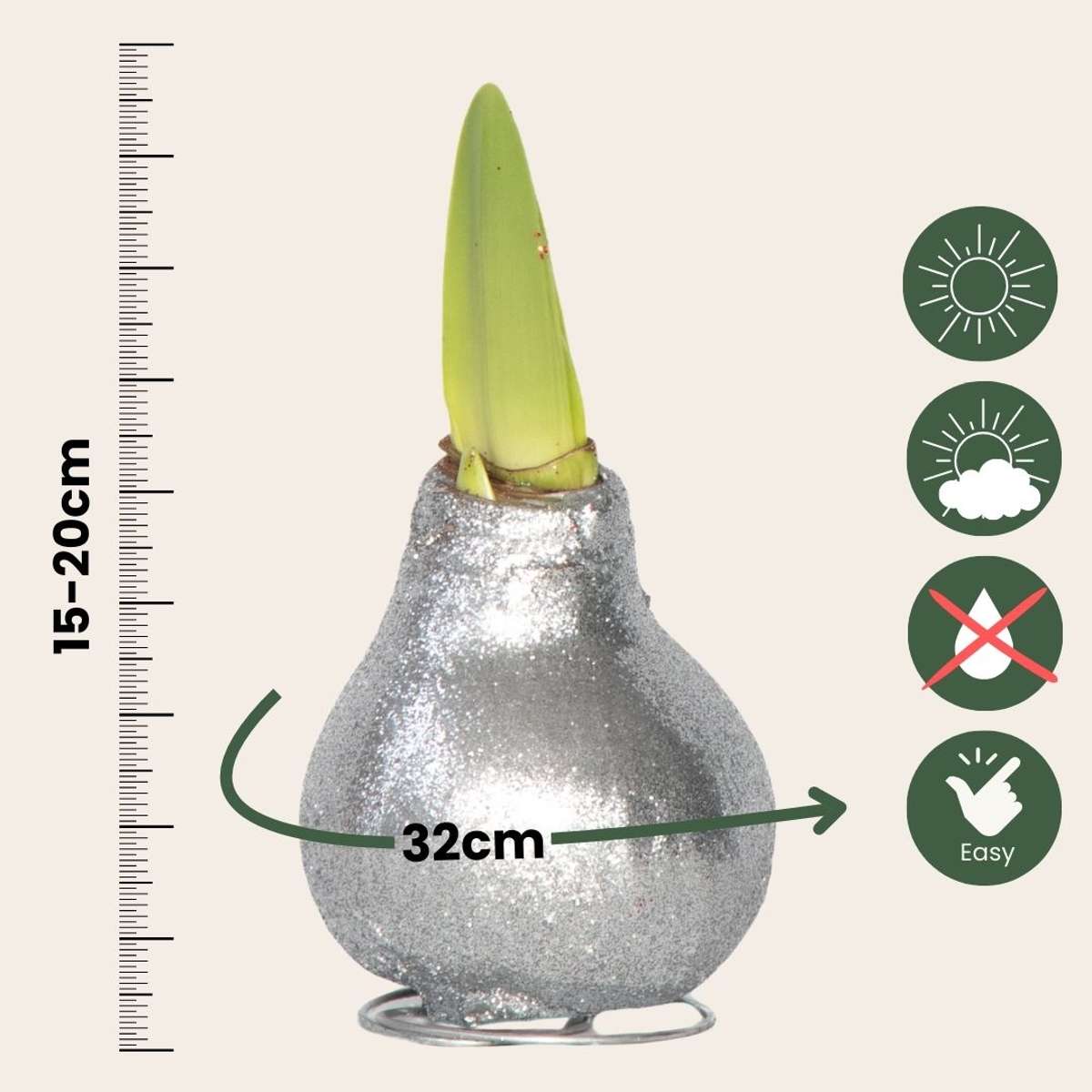 Bring the winter atmosphere into your home with the Amaryllis! The beautiful, stylish red flowers steal the show in your winter interior. The beautiful flowers have a flowering period of 3 to 6 weeks. The bulb is about 32cm in circumference and comes with a glamorous silver glitter wax coating.