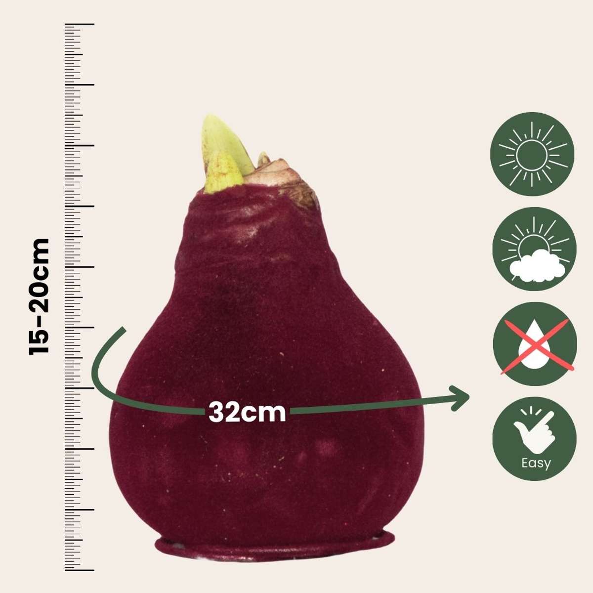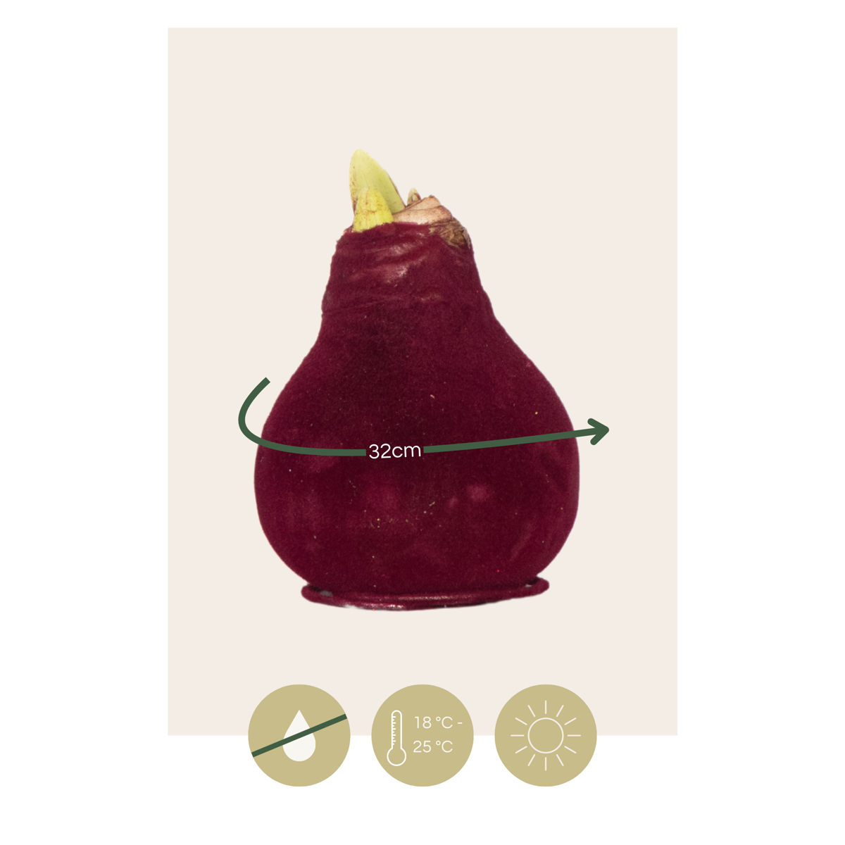 Bring the winter atmosphere into your home with Amaryllis! The beautiful and elegant red flowers steal the show in your winter interior. The beautiful flowers have a flowering period of 3 to 6 weeks. The bulb is about 32cm in circumference and comes with a glamorous burgundy velvet wax coating.