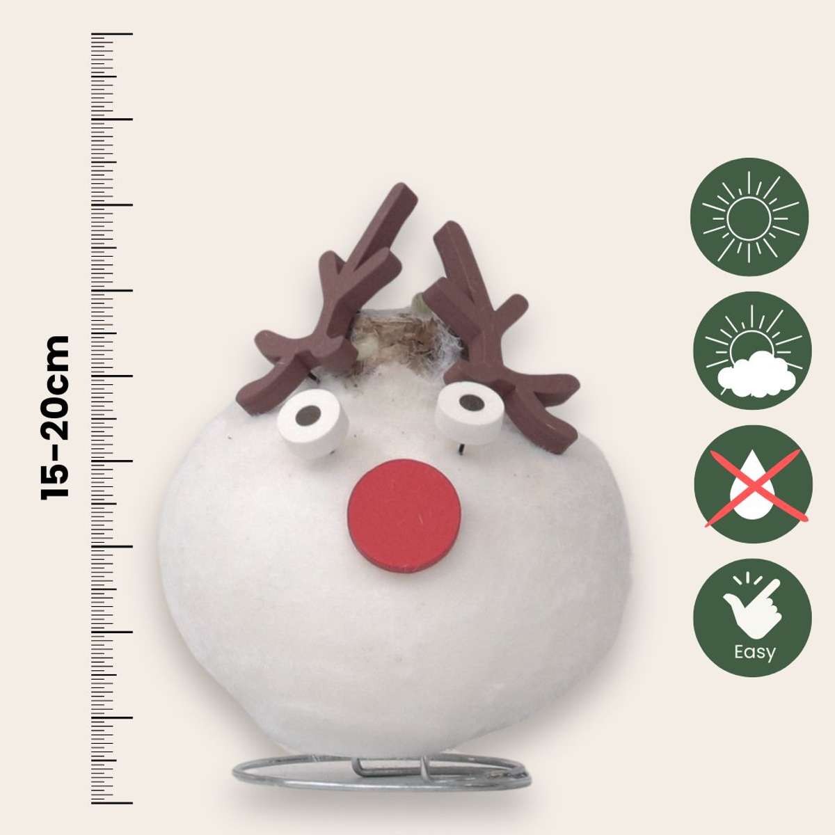 Bring winter charm into your home with the Amaryllis! The beautiful, elegant red flowers add warmth and colour to your winter interior. The flowers bloom for 3 to 6 weeks. The bulb has a playful reindeer look with a red nose and antlers, creating a cheerful and festive touch. A unique eye-catcher, perfect for the Christmas season!