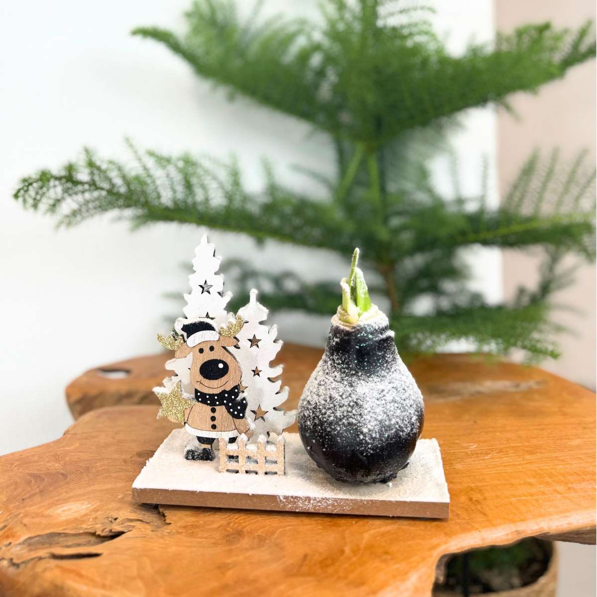 Bring winter charm into your home with the Amaryllis! The beautiful red flowers add warmth and a festive touch to your interior. With a blooming period of 3 to 6 weeks, you can enjoy their elegant beauty for weeks. The bulb features a black wax layer with a subtle snow effect and is accompanied by a cute wooden reindeer. A stylish eye-catcher that perfectly fits the magic of the holidays.