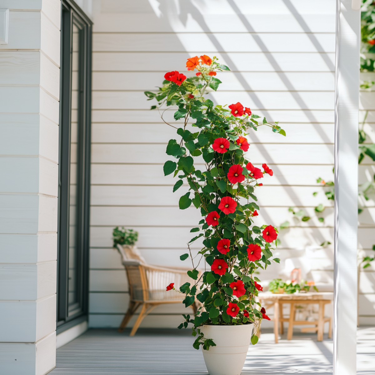 The Thunbergia Alata, better known as Black-Eyed Susan has become even more colourful. With its magnificent bright colours, this is a splendid subject for the patio or decking. Black-Eyed Susan is native to tropical Africa and loves heat. It is named after its striking black heart, which looks just like the pupil of an eye. The flowers are red. This particular fast-growing vine blooms all summer long until late autumn.