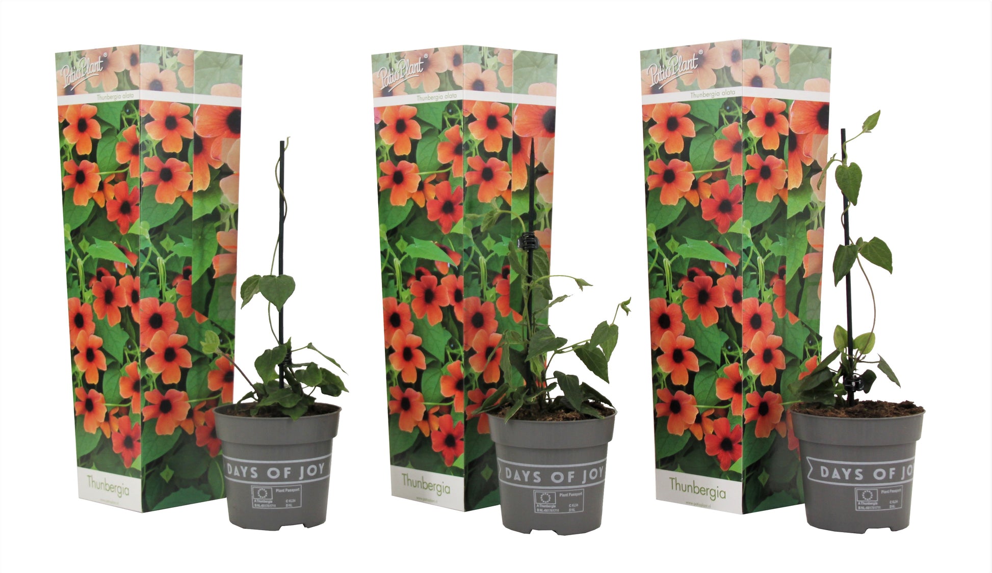 Thunbergia Alata is usually grown as an annual plant. It is possible to overwinter this perennial plant in a warm conservatory or greenhouse. Thunbergia Alata is a fantastic tub plant. Use a large flower pot, planter or hanging basket (minimum diameter of 50cm) with holes in the bottom. The long shoots of Thunbergia Alata will look beautiful if they cover a frame, a climbing support or bamboo canes. Place the climbing frame firmly in the pot. Furthermore, the plant should be watered regularly. It also likes to be given nutrition.