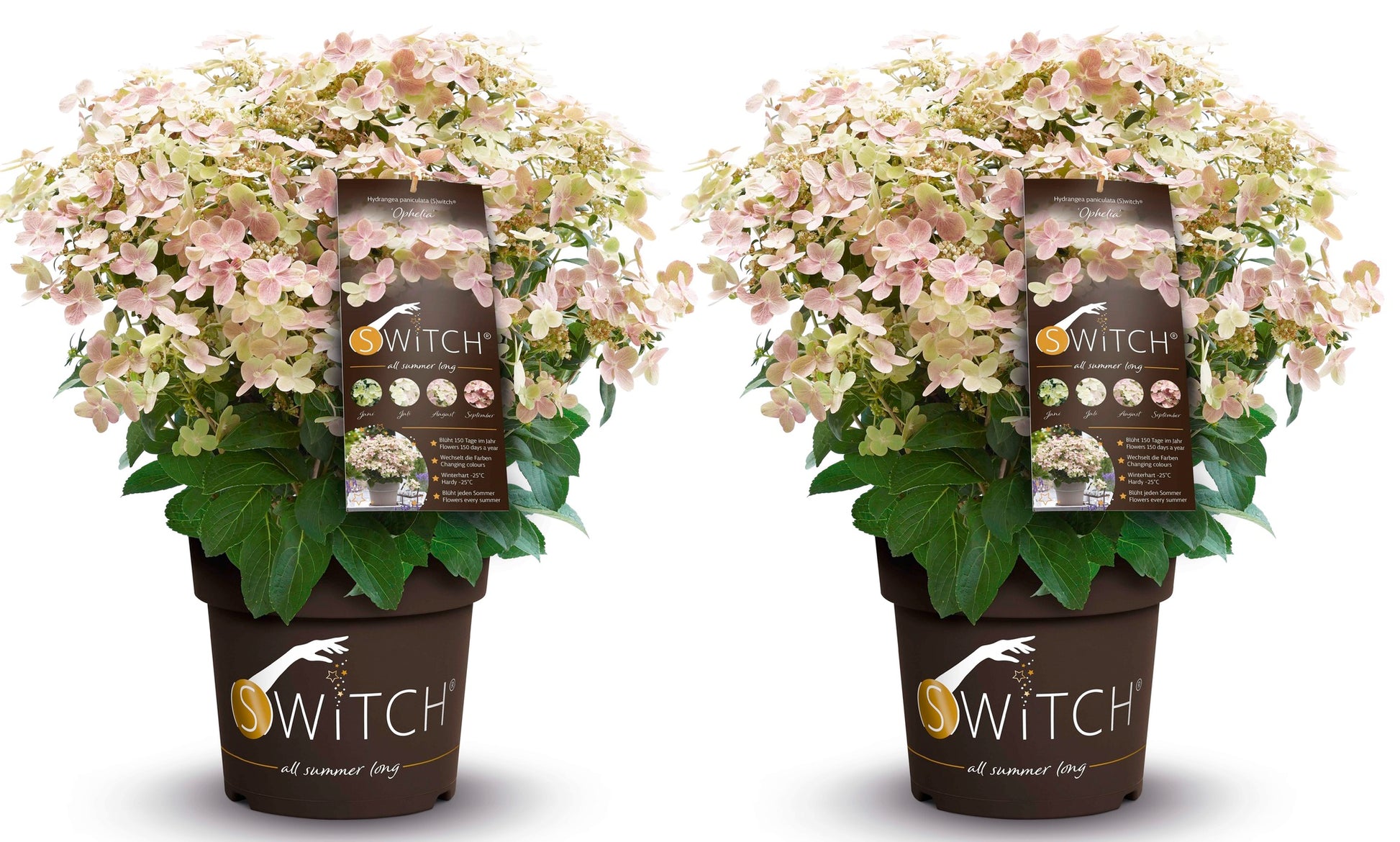 The hydrangea (S)witch Ophelia enchants your garden. It changes colour in a fascinating way from June to September. The colour spectacle starts with light lime yellow, which after a while magically becomes pure white and then changes into old pink. The blossoms finally turn red, which is of great decorative value, also for flower arrangers. The blossoms can remain on the plant all winter and must be removed in the spring. The hydrangea paniculata (S)witch Ophelia is very robust and hardy. A plant that enchants its surroundings, to be planted in a container on the balcony or terrace.