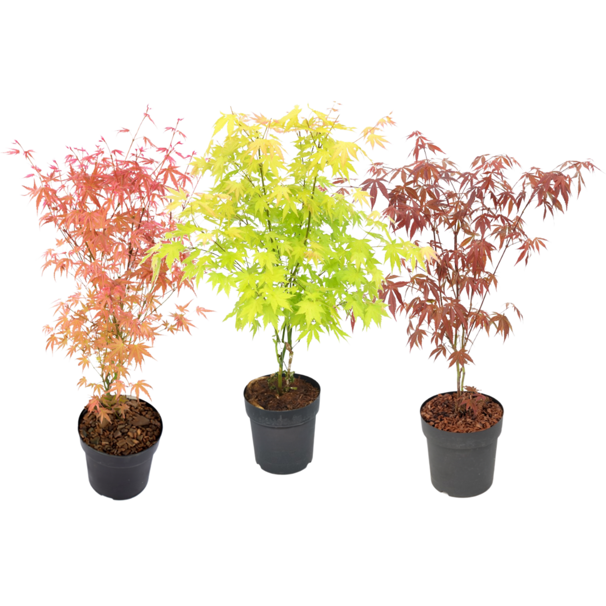 Bring your garden, patio or balcony into an oriental atmosphere with these beautifully colored Japanese maple trees. Japanese maples are known for their beautifully colored leaves and are a real eye-catcher. Each tree has its own beautiful colors and leaves that add a lot of variety to your garden. The plants are hardy and can therefore be planted in the garden. Plant them in the ground or in pots, individually or as a group. The Japanese maples grow to different heights and can therefore be put together well. They can also be cut into beautiful bonsai trees! The set contains 3 different species: Acer palmatum 'Atropurpureum', Acer palmatum 'Orange Dream' and Acer palmatum 'Beni Maiko'.