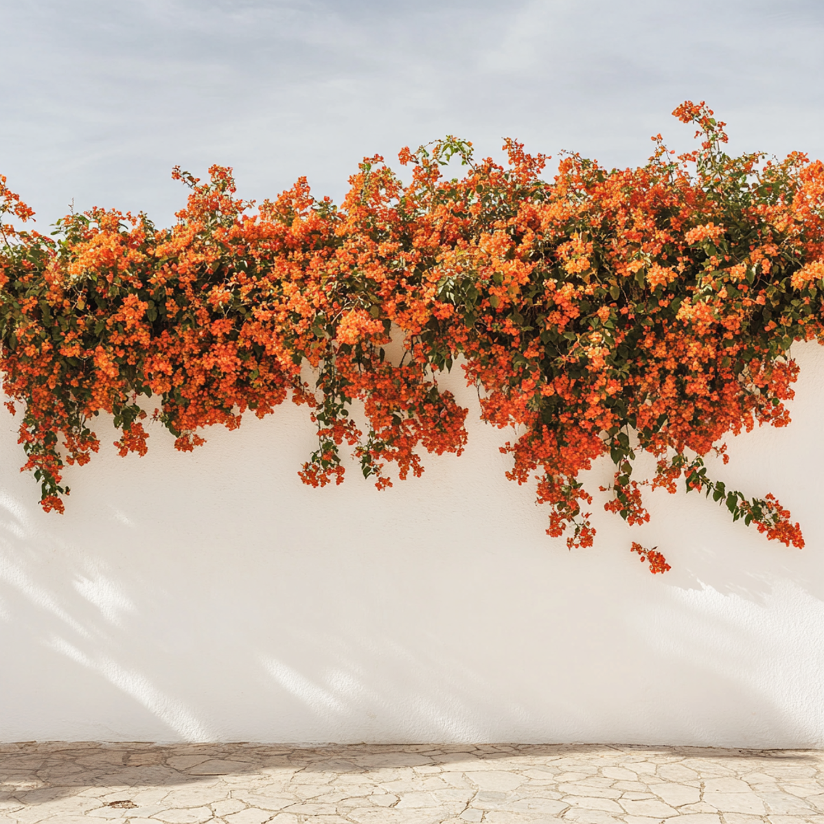 The Bougainvillea is a beautiful, showy climber with colourful papery bracts. What could be more beautiful than placing the Bougainvillea in front of a light wall so the colours pop out even more? With its vibrant orange red colour, it is a plant that delivers the real summer feeling. Originally, the Bougainvillea comes from Brazil. However, it is very common in southern Europe, making it a true Mediterranean plant. To maintain the beautiful colours, the plant needs a lot of sunlight. The more sunlight it receives on its leaves, the brighter the colours will become.